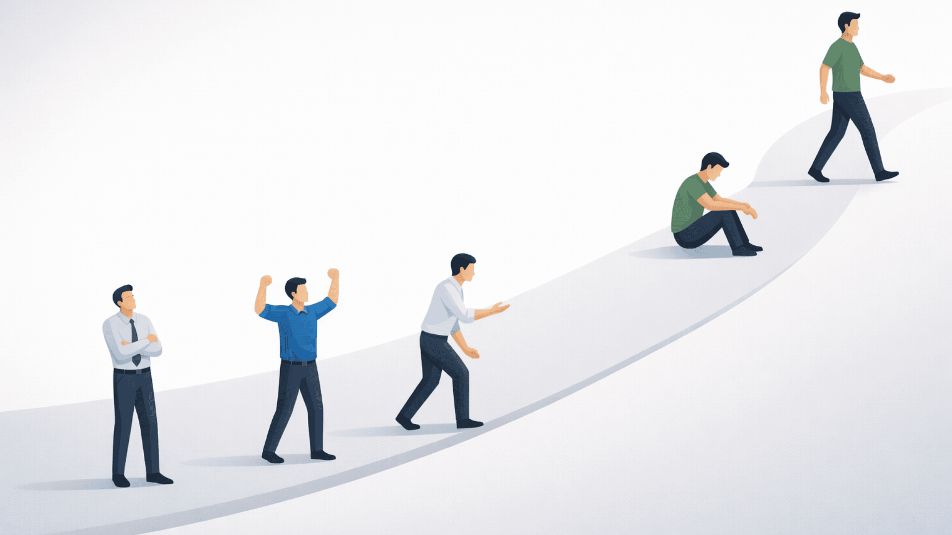 Transformations often follow five human change stages: Shock/Denial → Anger → Bargaining → Depression → Acceptance; success depends on supporting teams through the curve.